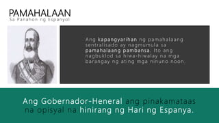 Sinakop ng mga Espanyol ang Pilipinas sa loob ng 333 taonSa pananakop nila sa Pilipinas may ginamit silang dalawang pangunahing estratehiya. Isinaayos din ng Espanyol ang pamayanan upang mabilis na mapalaganap ang Kristyanismo. Ang maginoo ay maaring ihambing natin sa mayayaman at makapangyarihan sa kasalukuyanAng ikalawang uri ay nahahati sa maharlika at timawa na tinatawag ding mga malayang mamamayan Maari silang ihambing sa gitnang uri ng.