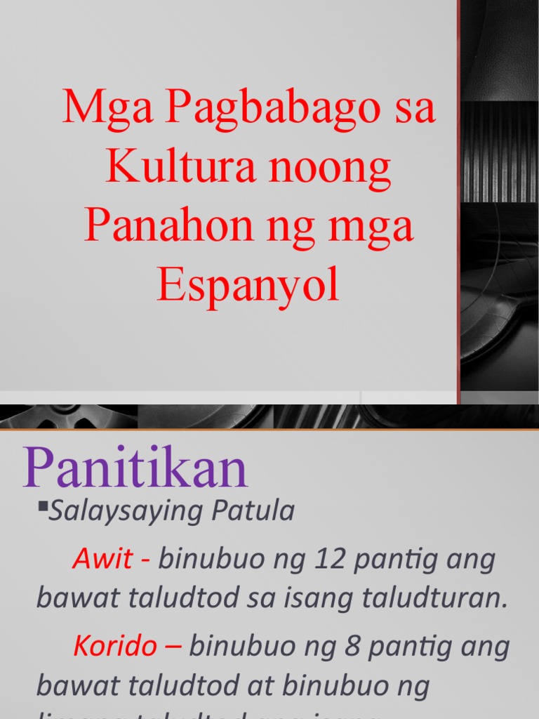 Mga pagbabago sa pananakop ng espanyol. Naging mabisa at madali ang pagtuturo ng relihiyon at katesismo. Nasusuri ang pagbabago sa kultura ng mga Pilipino sa Panahon ng Espanyol. DI-PIKSIYON NON-FICTION-Bumabatay ang may akda sa mga tunay na balita at iba pang kaganapan.