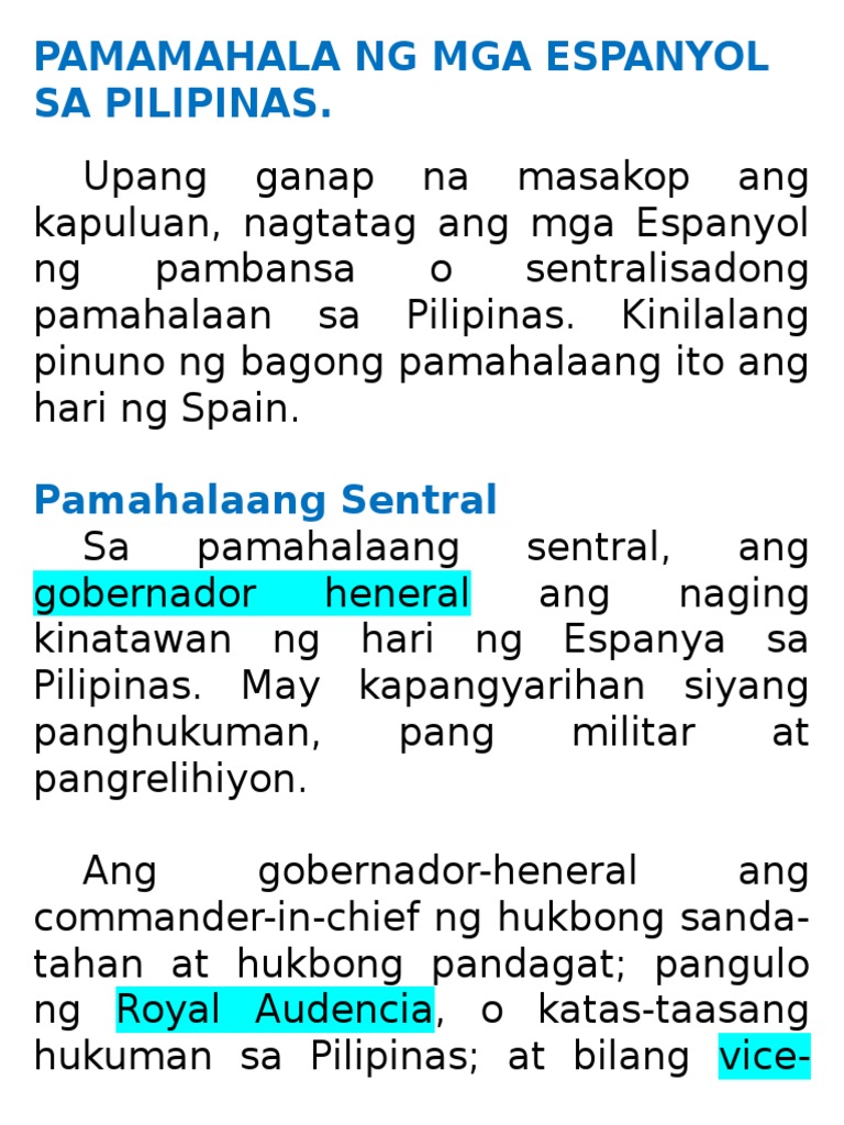 Pamahalaan ng pilipinas sa ilalim ng espanya. Cubar 1982 Pagkaraan ng 43 taong pagkakadiskubre ni Magellan ng Pilipinas noong 1521 nagsidatingan ang mga Espanyol kasama ng ibat ibang orden ng mga prayle na. Corregimiento - Ito ang mga lalawigang patuloy na lumalaban.