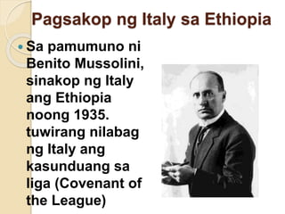 Tuwirang nilabag ng Italya ang Kasunduan sa Liga ETHOPIA Covenant of. Pagsakop ng Italya sa Ethiopia Sa pamumuno ni Benito Mussolini sinakop ng Italya ang Ethiopia noong 1935. Digmaang sibil sa spain.