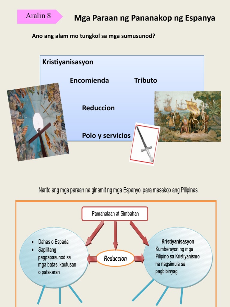 Paraan ng Pananakop ng Mga Espanyol sa Pilipinas Ang Kristiyanismo at Ang Reduccion created by Rose Tabije on 13112019. Paraan ng Pananakop Ang mga paaralan munisipyo simbahan libingan at plaza ay magkakasama sa isang lugar na tinatawag na kabesera upang higit ng mapalapit sa simbahan. Impluwensiyang Espanyol sa kaayusan ng mga bayan kalagayang pangkabuhayan.